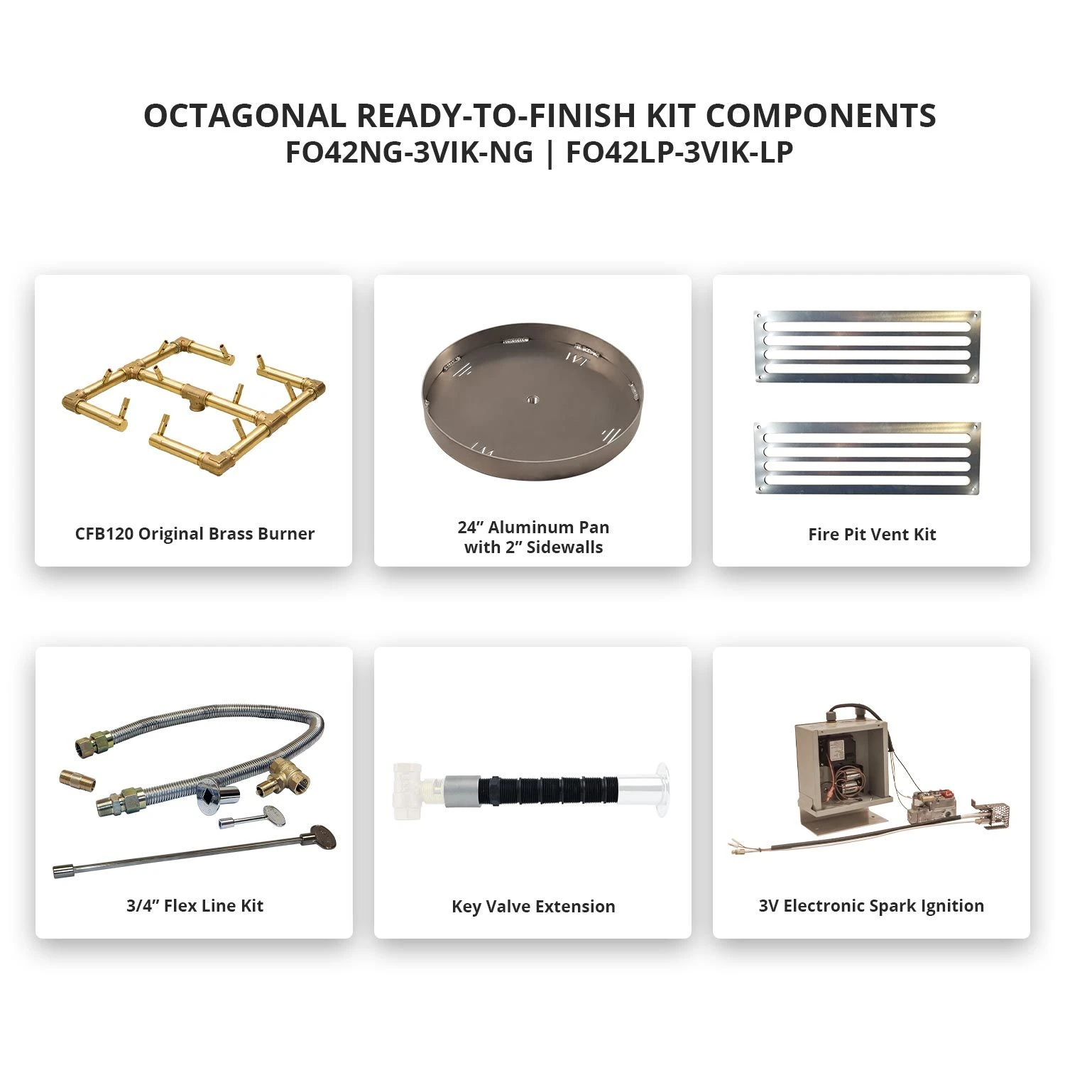 The included burner kit includes a 1/2-inch flex line that measures 36-inches long, a 1/4-turn ball valve with chrome plated decorative flange and 12-inch key, and a 30-inch round pan to combine the necessary components to install the burner system. Five ignition options are available in order to offer a wide variety of ignition types to start your fire pit.