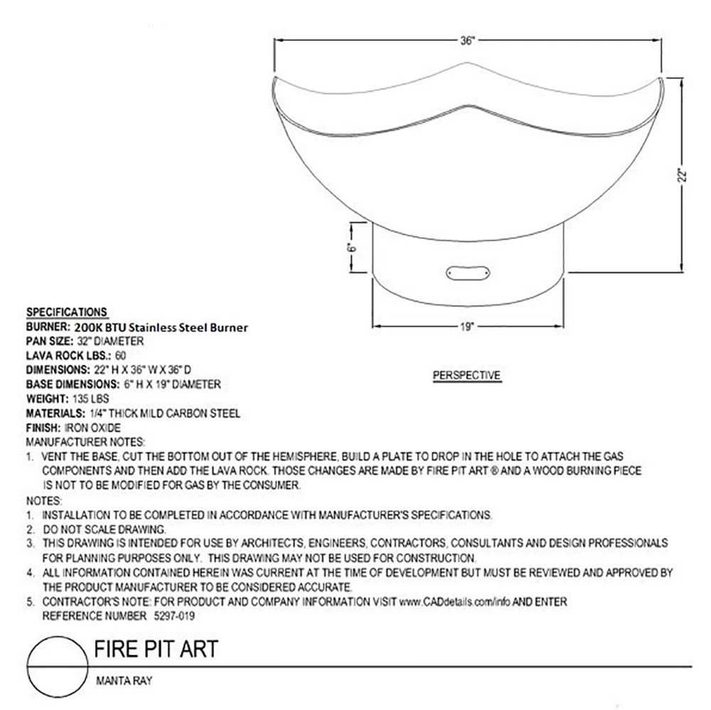 ManufacturerFire Pit ArtMade in USAYesWeight (Pounds)135Burner Size24-InchesOverall Height (Inches)22Overall Diameter36-InchesShapeRoundMaterialCarbon SteelBurner MaterialStainless SteelBTU200000Burner ShapePentaManufacturer Part NumberMANRC-Config