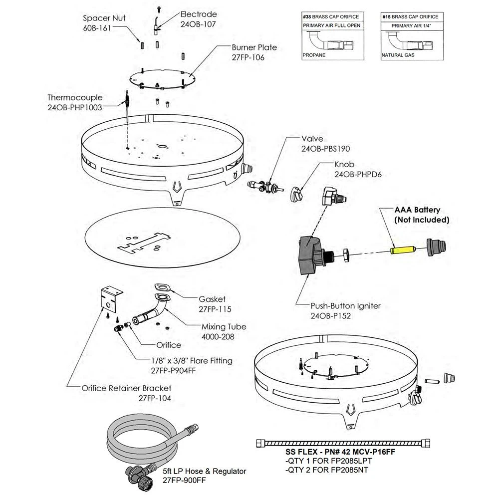 ManufacturerKingsmanCertificationCSA/ULFuel TypeNatural Gas, PropaneManufacturer Part NumberFP2085T-ConfigOverall Width (Inches)20Overall Height (Inches)4.5Overall Diameter20-InchesBurner Pan TypeTrough