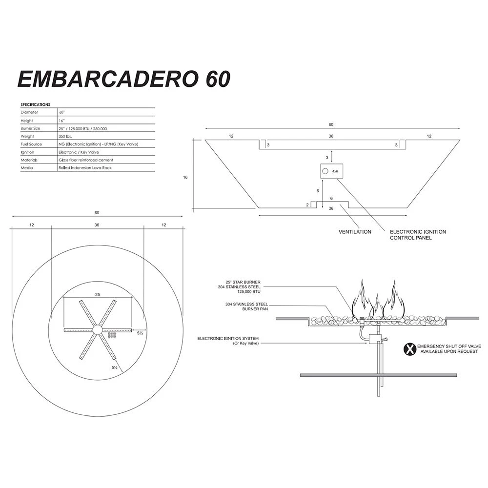 Stores LP Tank In BaseNoManufacturerPrism HardscapesSeriesEmbarcaderoWeight (Pounds)350IgnitionMatch Light or Electronic IgnitionBurner Size18-InchesOverall Height (Inches)16Overall Diameter60-InchesShapeRoundMaterialConcreteBurner Material304 Stainless SteelBTU65000Burner Pan Material304 Stainless SteelBurner Pan Size25-InchesBurner CoverNoManufacturer Part NumberPH-458-Config