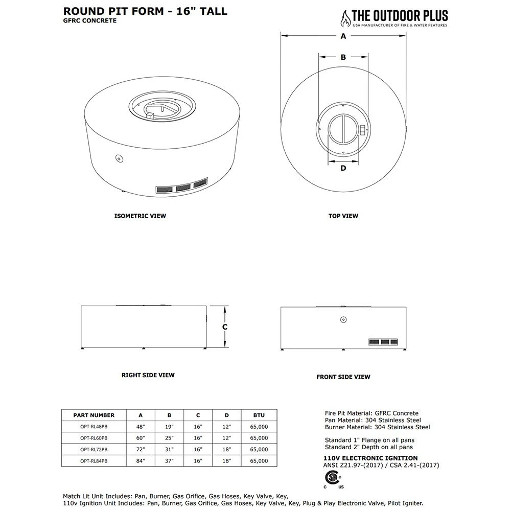 ManufacturerThe Outdoor PlusFuel TypeNatural Gas, PropaneMade in USAYesManufacturer Part NumberOPT-RL60-ConfigOverall Width (Inches)60ShapeRoundBurner MaterialStainless SteelBurner Pan MaterialStainless Steel