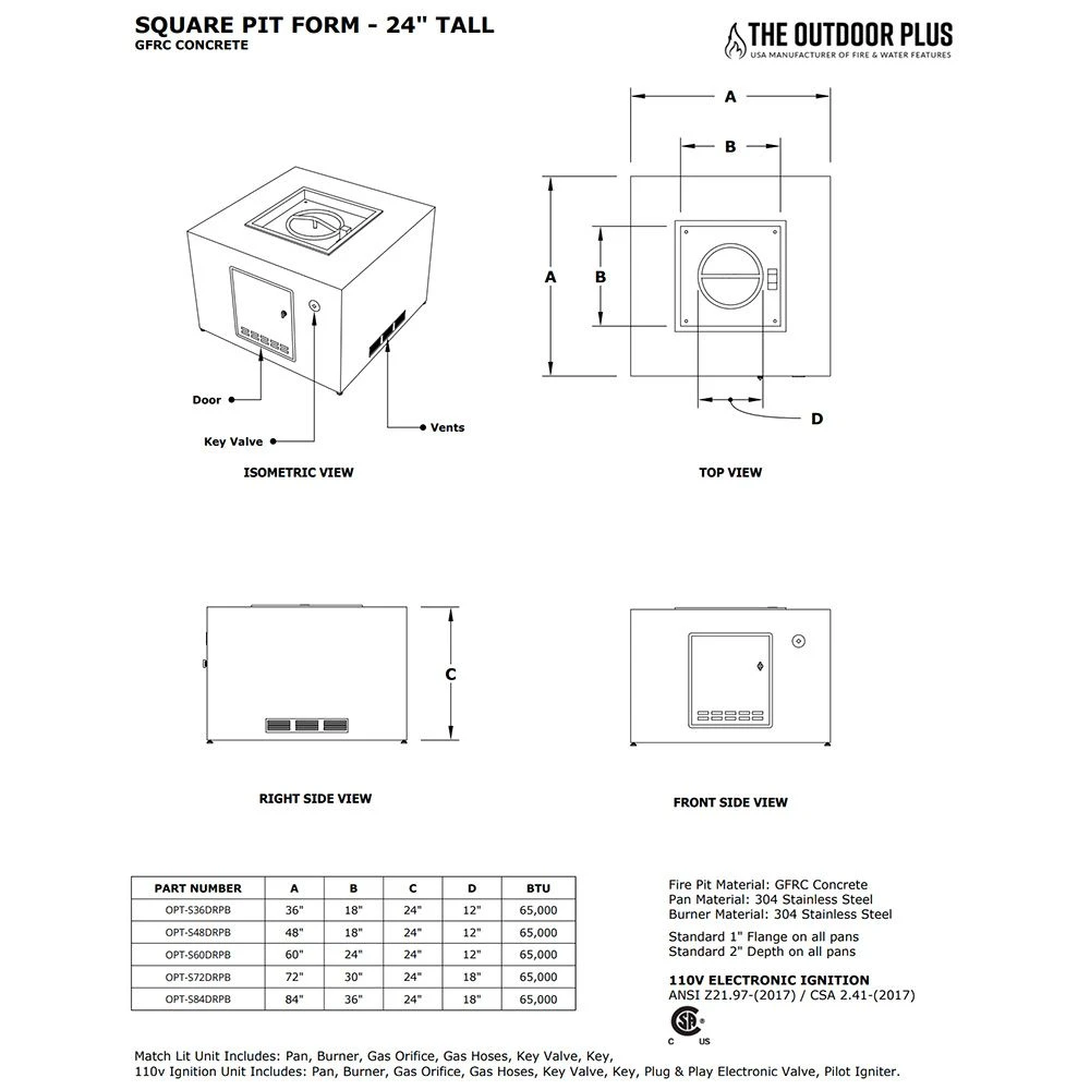 This partially finished 84-inch square fire pit form comes complete with a 36×36-inch drop-in burner pan, 24-inch burner, key valve, whistle free hoses and a stainless steel air vent to make complete installation as easy and safe as possible. This fire pit package allows you to choose from Match Light (with or without Flame Sense), Spark, 110V Electronic or 12V Electronic options and comes with or without a propane tank door depending on your needs. Choose from the options above and make your patio dreams come true!