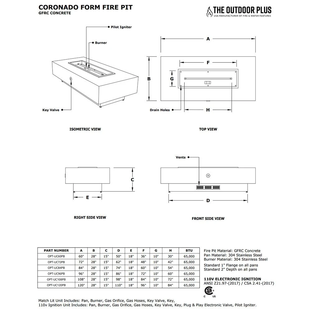 The partially finished Coronado 120×36-inch rectangular fire pit form comes complete with a 102×12-inch drop-in burner pan, 96-inch burner, key valve, whistle free hoses and a stainless steel air vent to make complete installation as easy and safe as possible. This fire pit package allows you to choose from Match Light, Spark, or Electronic ignition depending on your requirements. Choose from the options above and make your patio dreams come true!