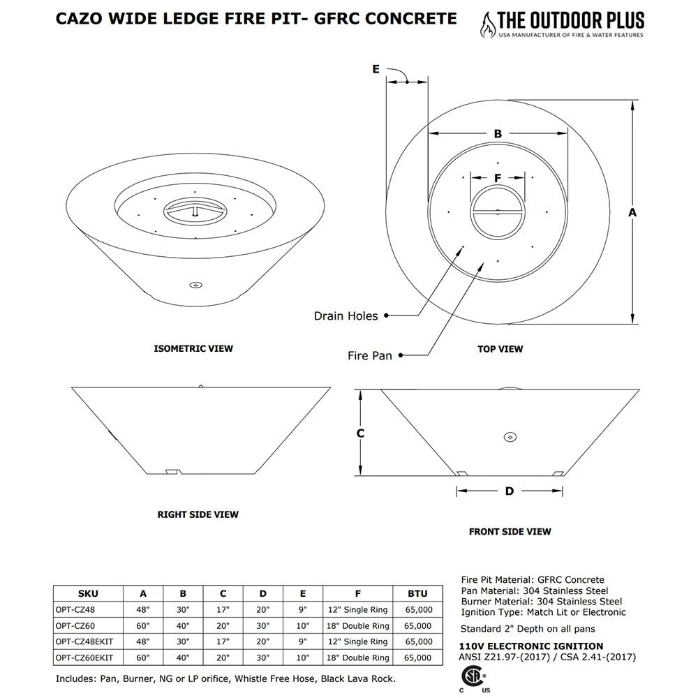 Stores LP Tank In BaseNoManufacturerThe Outdoor PlusFuel TypeNatural Gas, PropaneSeriesCazoMade in USAYesOverall Height (Inches)17ShapeRoundMaterialConcreteManufacturer Part NumberOPT-CZxx-Config