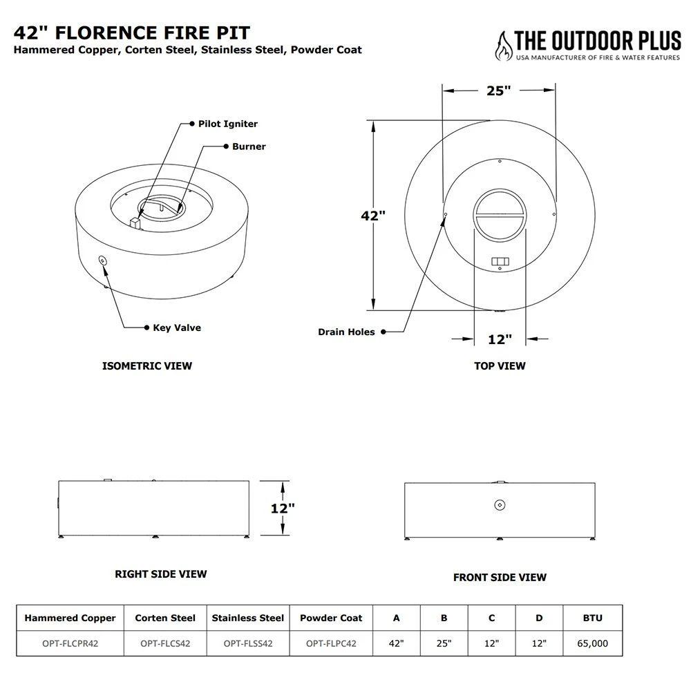 Stores LP Tank In BaseNoManufacturerThe Outdoor PlusFuel TypeNatural Gas, PropaneSeriesFlorenceMade in USAYesWeight (Pounds)315Overall Width (Inches)42Overall Length (Inches)42Overall Height (Inches)12ShapeRoundMaterialPowder Coated SteelBTU65000Manufacturer Part NumberOPT-FLPC42-Config