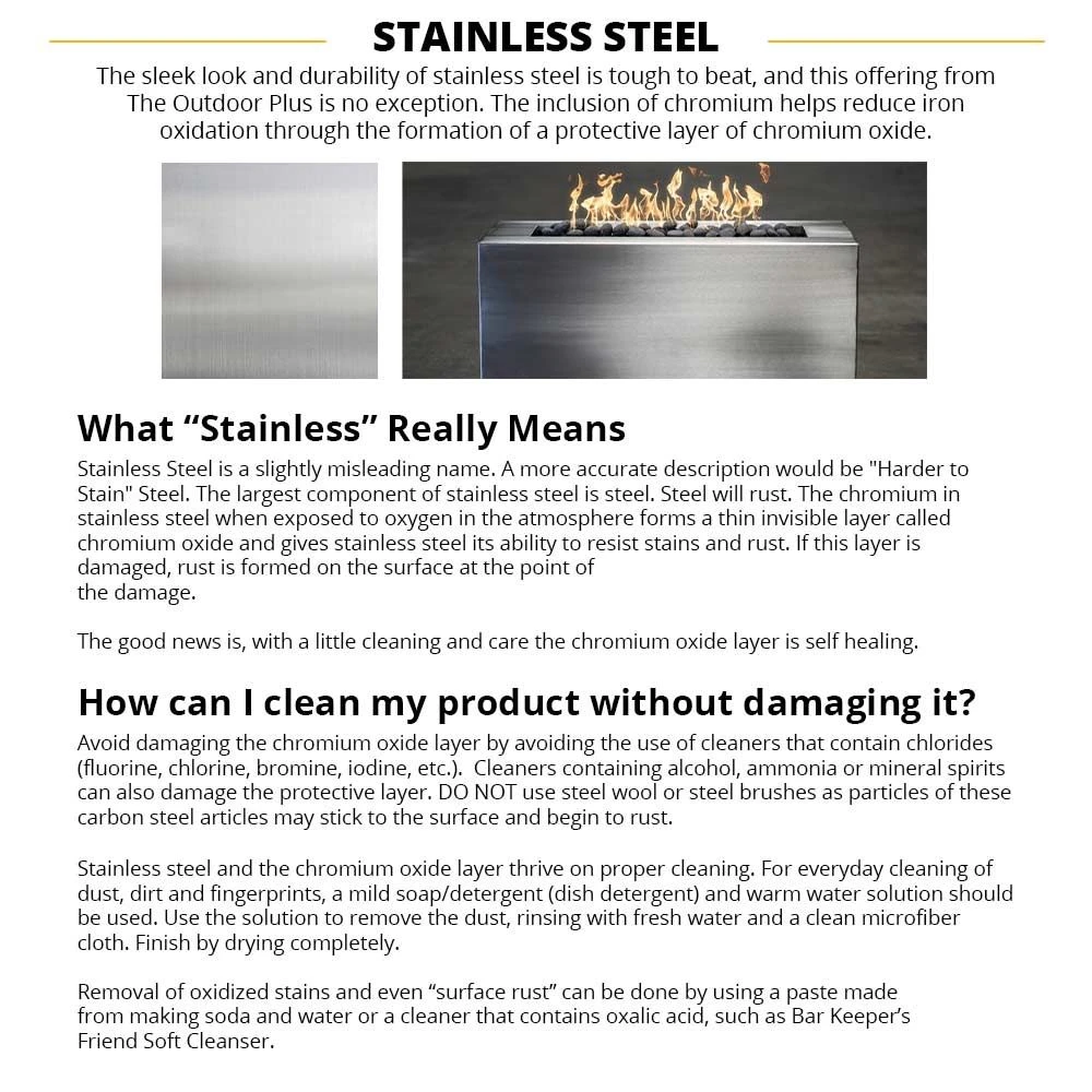 Stores LP Tank In BaseNoManufacturerThe Outdoor PlusFuel TypeNatural Gas, PropaneSeriesFormaMade in USAYesWeight (Pounds)215Overall Width (Inches)60Overall Length (Inches)60Overall Height (Inches)24ShapeSquareMaterialStainless SteelBTU65000Manufacturer Part NumberOPT-6060SQSS-Config