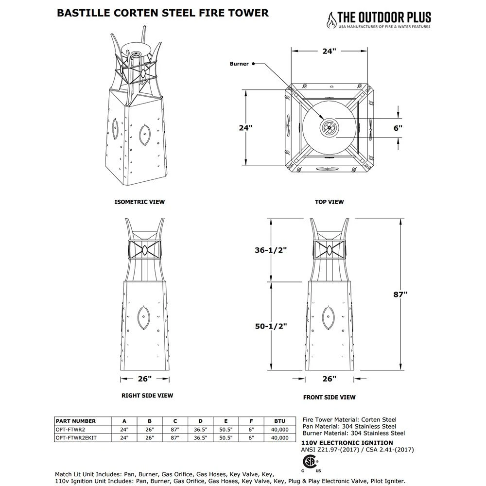 Stores LP Tank In BaseYesManufacturerThe Outdoor PlusFuel TypeNatural Gas, PropaneSeriesBastilleFeaturesStores LP TankMade in USAYesWeight (Pounds)145Overall Width (Inches)24Overall Length (Inches)24Overall Height (Inches)87MaterialCorten SteelBTU40000Manufacturer Part NumberOPT-FTWR2x-Config